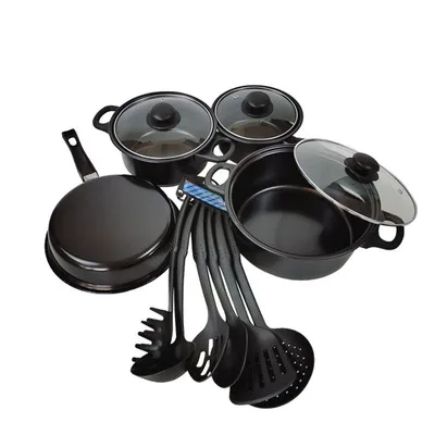 Набор включает в себя 13 предметов, предназначенных для приготовления различных видов блюд. В состав набора входит удобная сковорода, две кастрюли различного размера с крышками, а также супница с крышкой, которые подходят для приготовления супов, гарниров и других блюд. Кроме того, в набор входят разнообразные лопатки, ложки и другие аксессуары, обеспечивающие удобство при приготовлении блюд различных видов.
